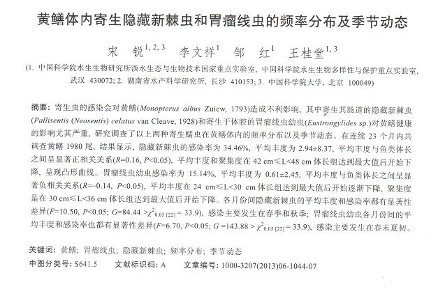 黃鱔體內(nèi)寄生隱藏新棘蟲和胃瘤線蟲的頻率分布及季節(jié)動態(tài)
